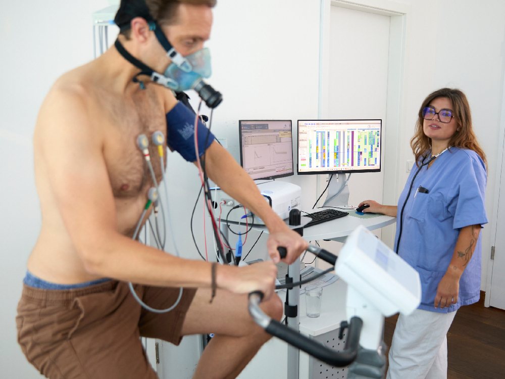 • Spiro-Ergometrie mit gleichzeitiger Ermittlung der Atemmechanik, Lungenüberblähung, Herzkreislauffunktions- und Muskelparameter