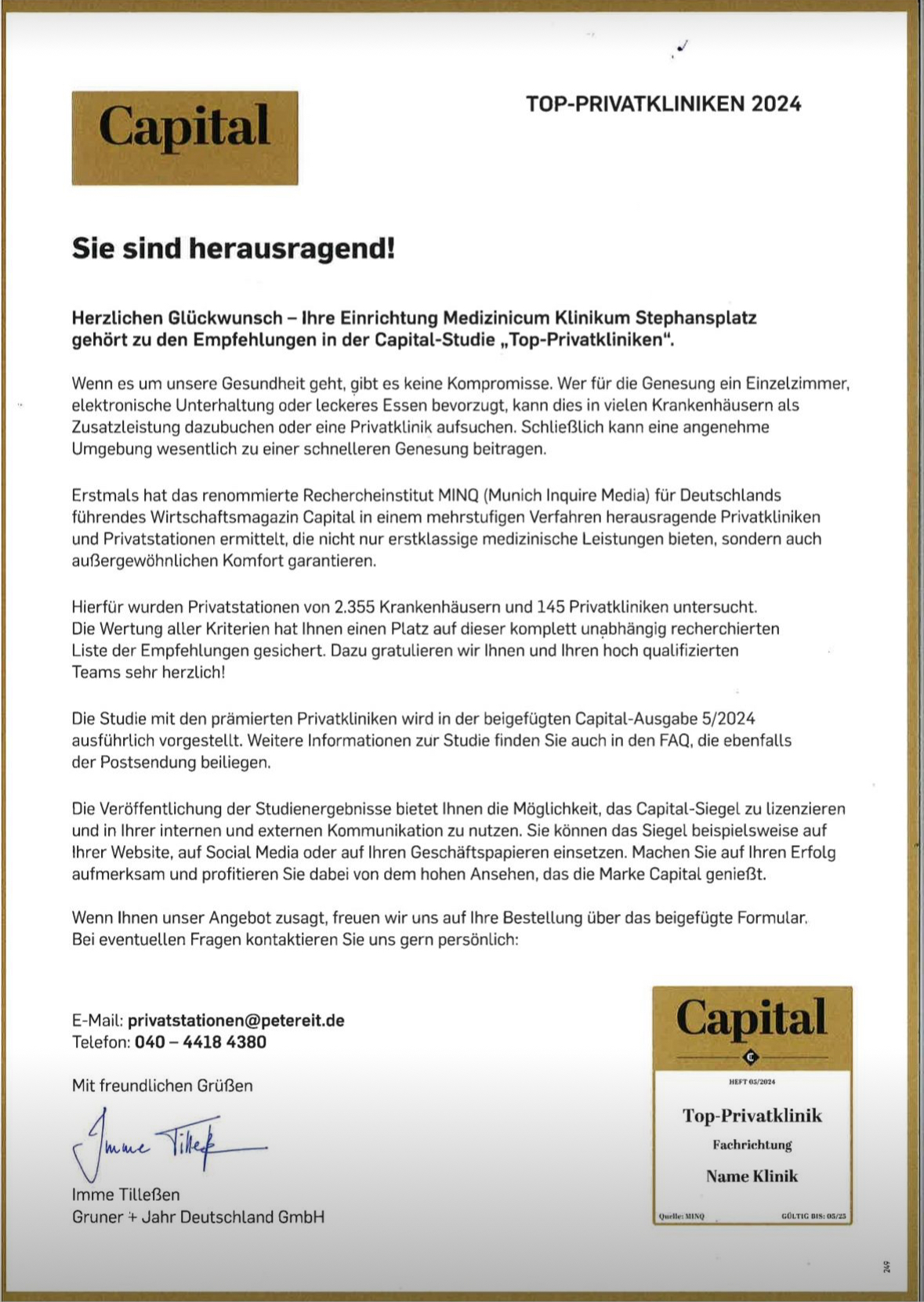 Das renommierte Rechercheinstitut MINQ (Munich Inquire Media) hat in Zusammenarbeit mit dem führenden Wirtschaftsmagazin Capital in einem mehrstufigen Verfahren herausragende Privatkliniken und Privatstationen in Deutschland ermittelt. Dabei wurden nicht nur erstklassige medizinische Leistungen, sondern auch außergewöhnlicher Komfort berücksichtigt.